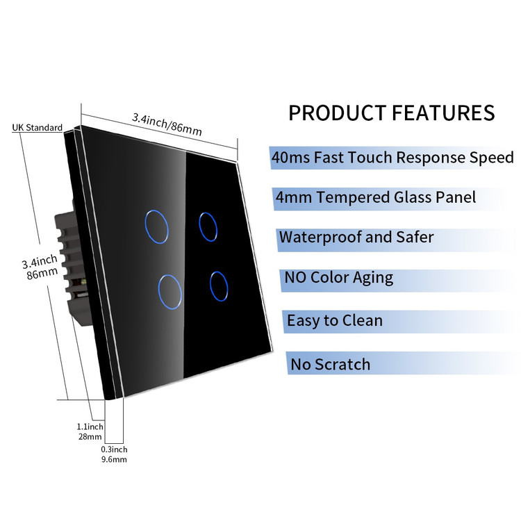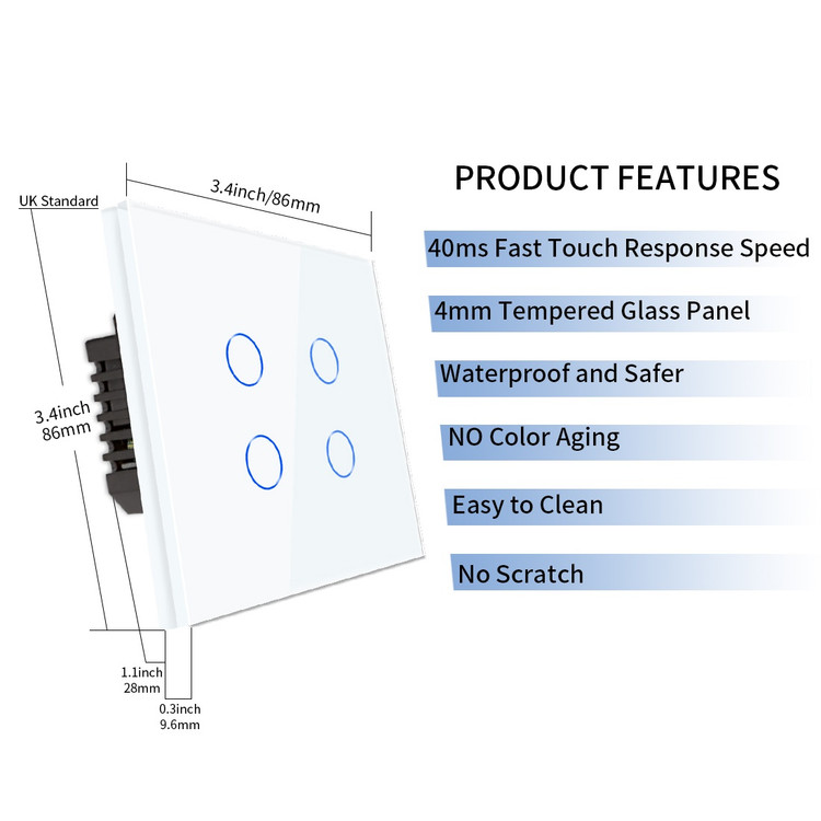 این کلید لمسی با چهار پل مجزا، امکان کنترل چندین بخش از سیستمهای نوری و برقی را به صورت همزمان فراهم میکند.