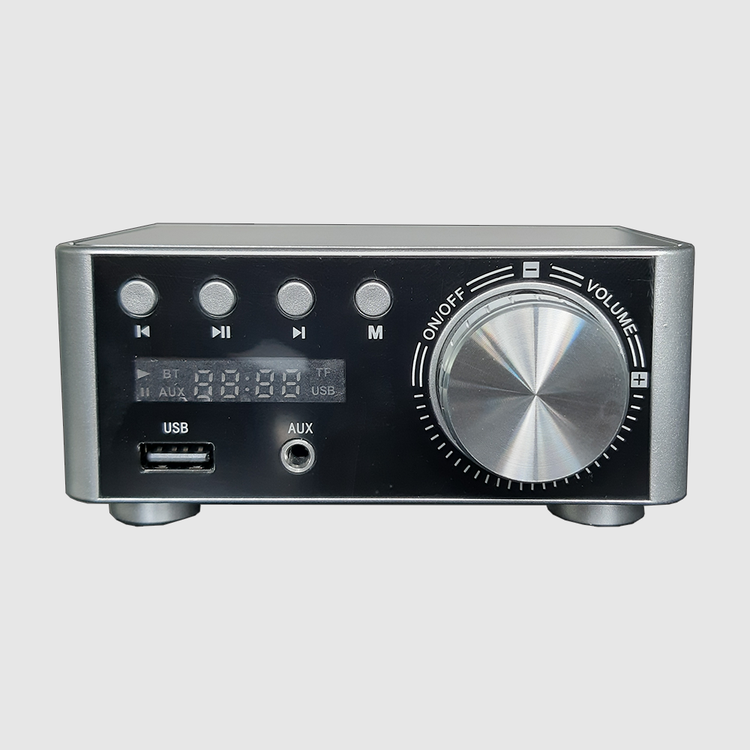 آمپلی فایر تمام اهمی دارای صفحه نمایشگر، دارای کلید ولوم، ورودی USBو SDکارت، بلوتوث، ورودی AUX، ورودی برق 9 تا 24 ولت DC
