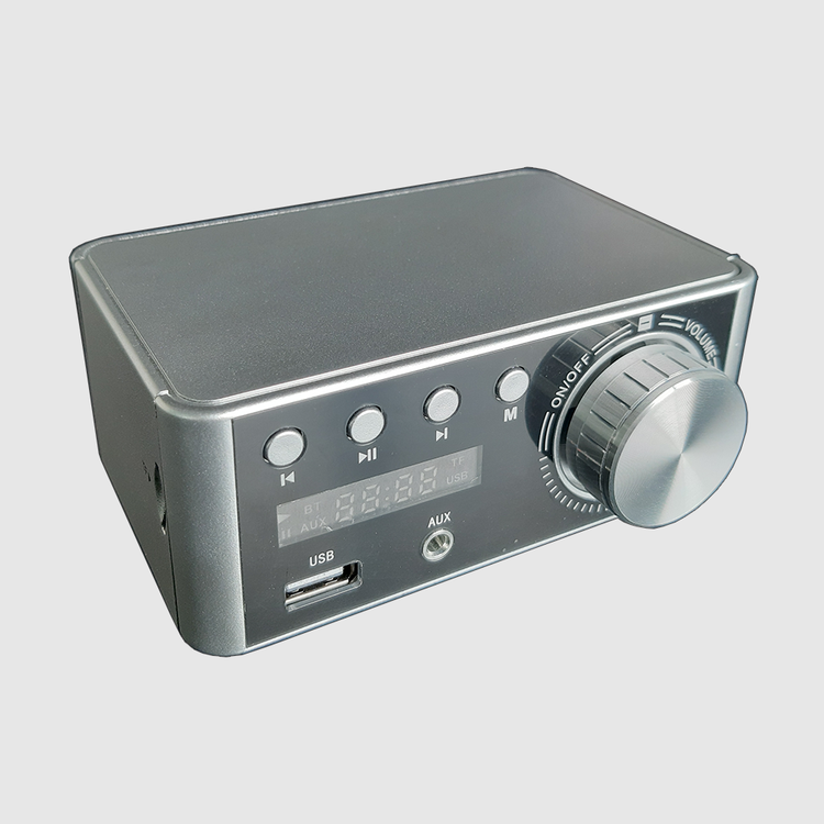 آمپلیفایر رومیزی MiniAmp تمام اهمی دارای صفحه نمایشگر، دارای کلید ولوم، ورودی USBو SDکارت، بلوتوث، ورودی AUX، ورودی برق 9 تا 24 ولت DC